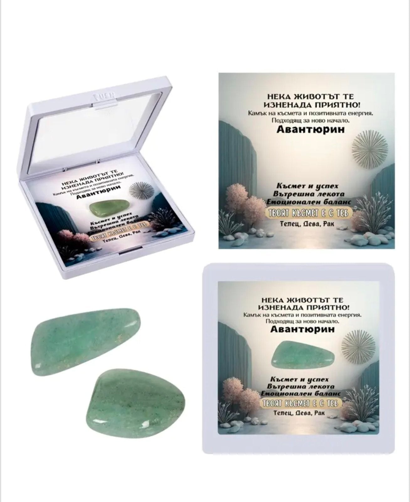 Полускъпоценен естествен камък - талисман ЗЕЛЕН ЯСПИ в рамкова ПВЦ кутия с прозрачно еластично фолио