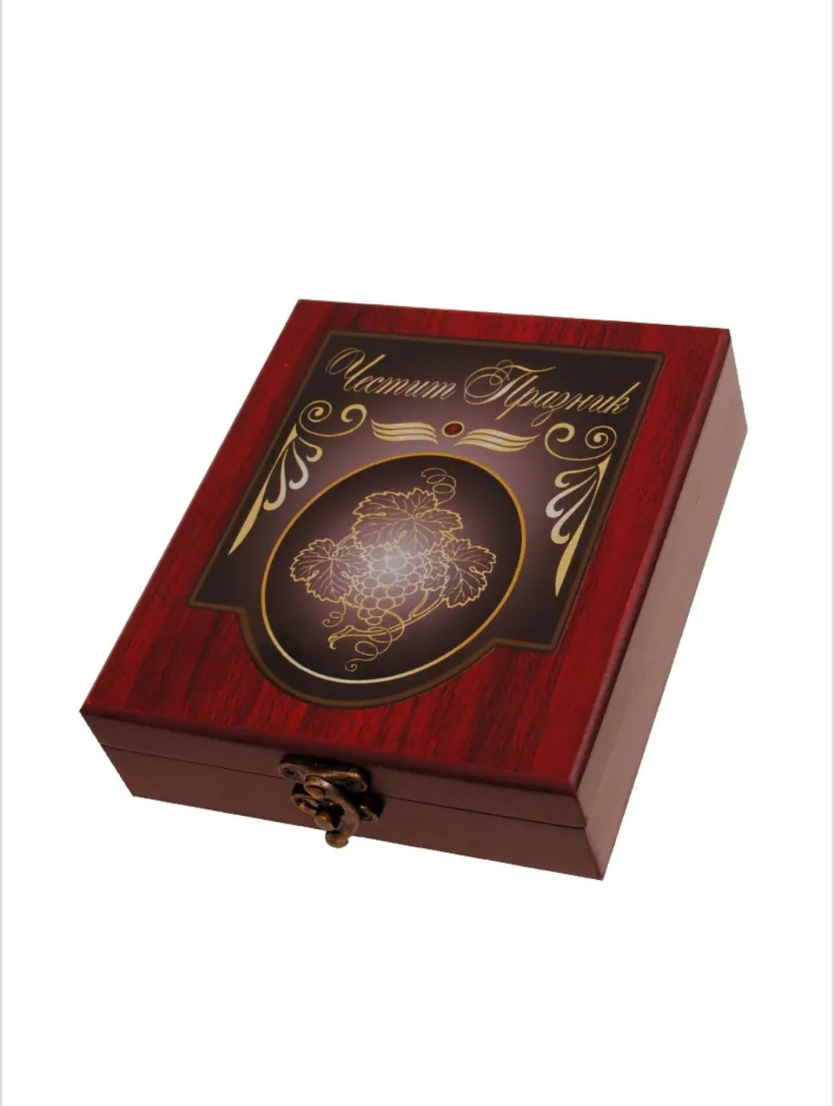 Луксозен и практичен комплект за вино, побран в елегантна кутия /дърво/, затваряща се с метална закопчалка.