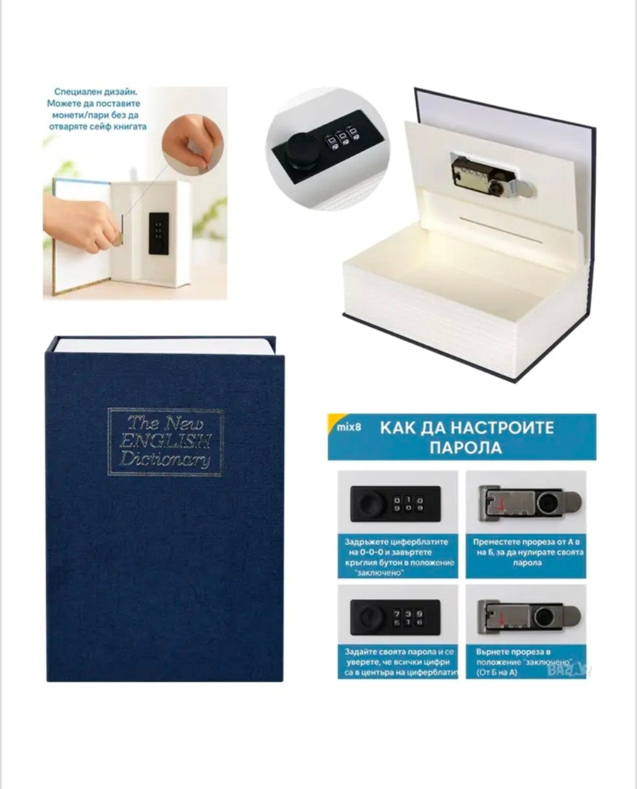 Скрит, стоманен сейф под маскировката на книга - сигурно скривалище пари, бижута и други ценности. Заключва се с трицифрен код /шифър/. фабричният код е"000" - във всяка кутия има лист с инструкции за промяна на кода.