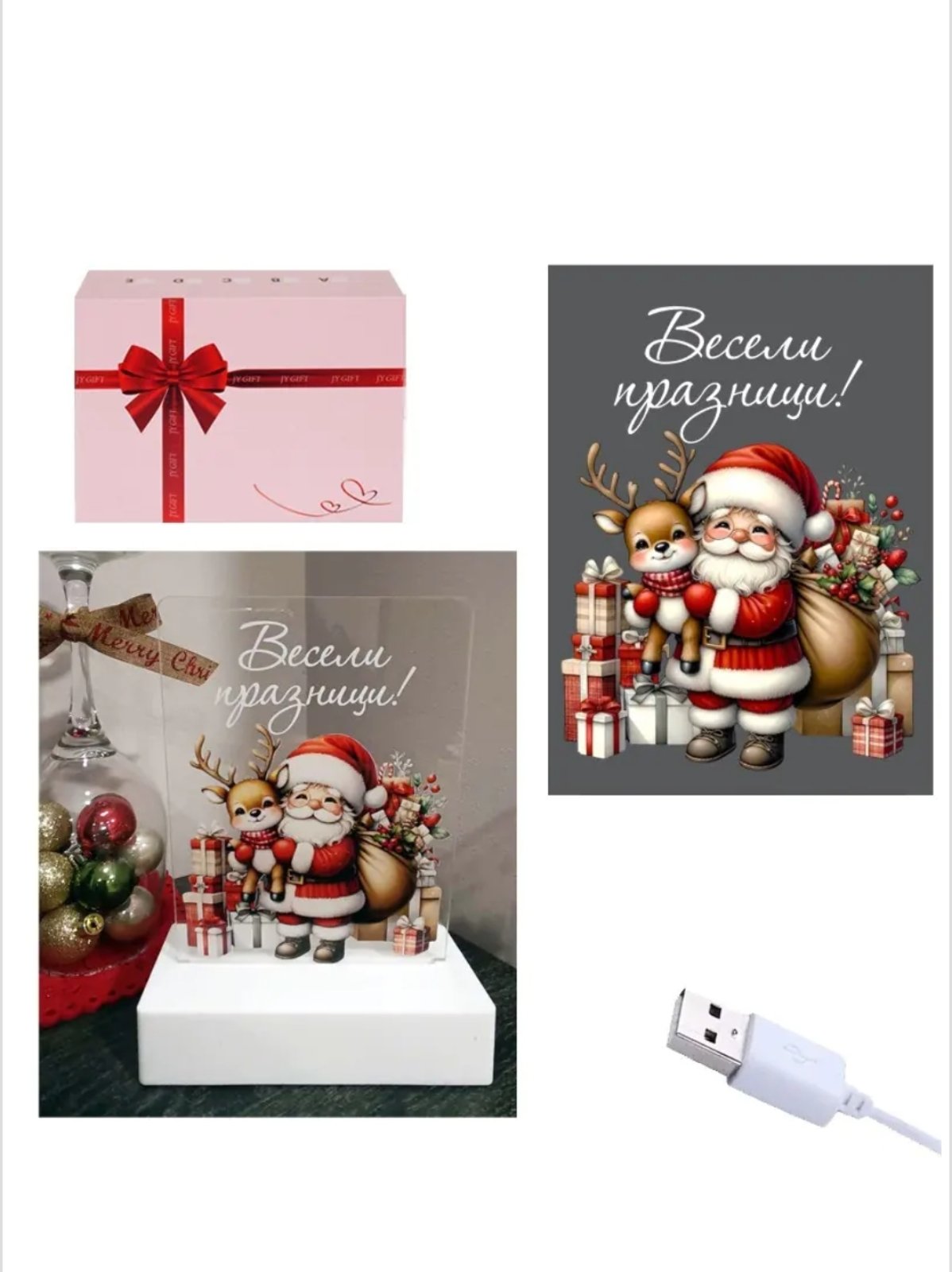 Коледна интериорна 3D - LED настолна лампа "Дядо Коледа с еленче" с USB кабел (пластмаса и плексиглас)