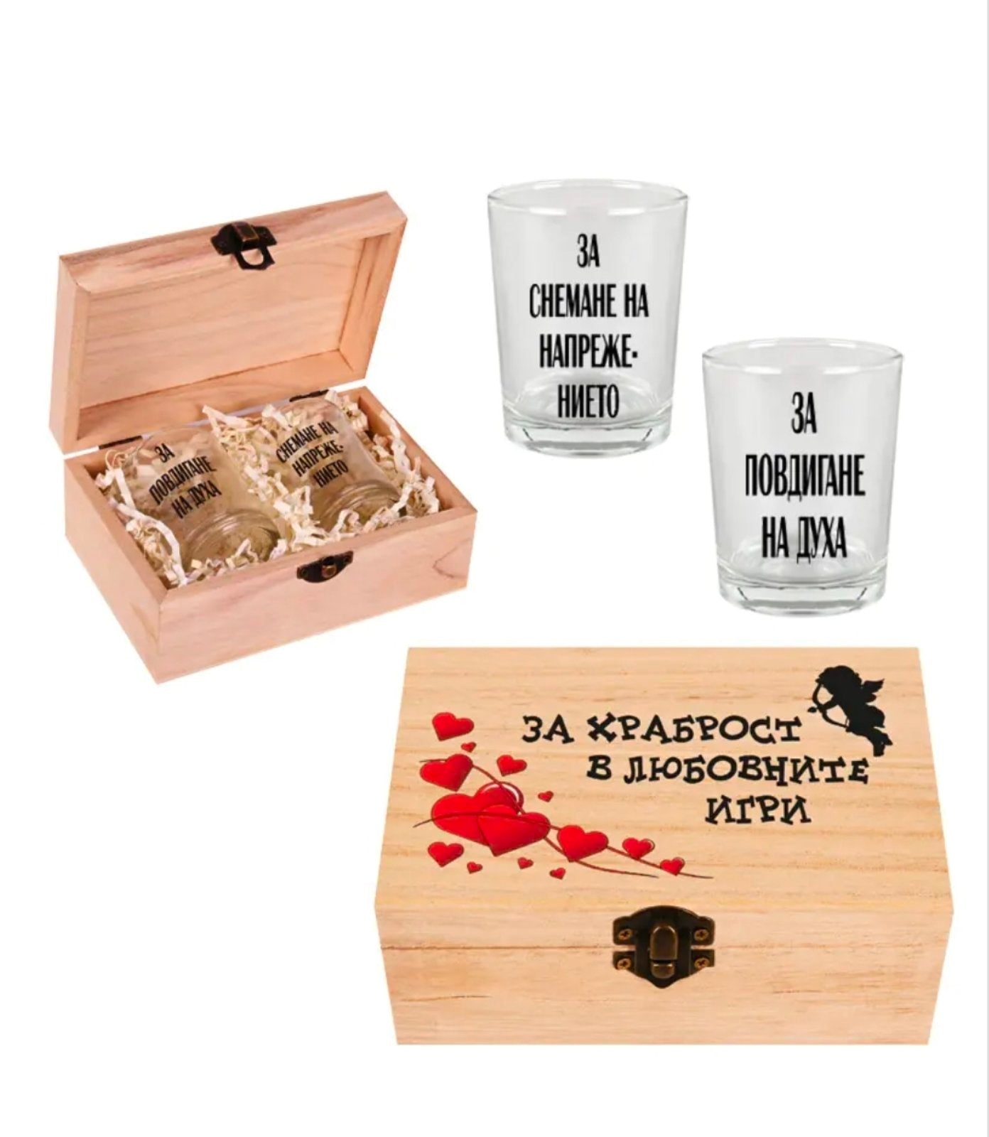 Кутия "За храброст в любовните игри" с два шота и хартиен пълнеж (дърво)