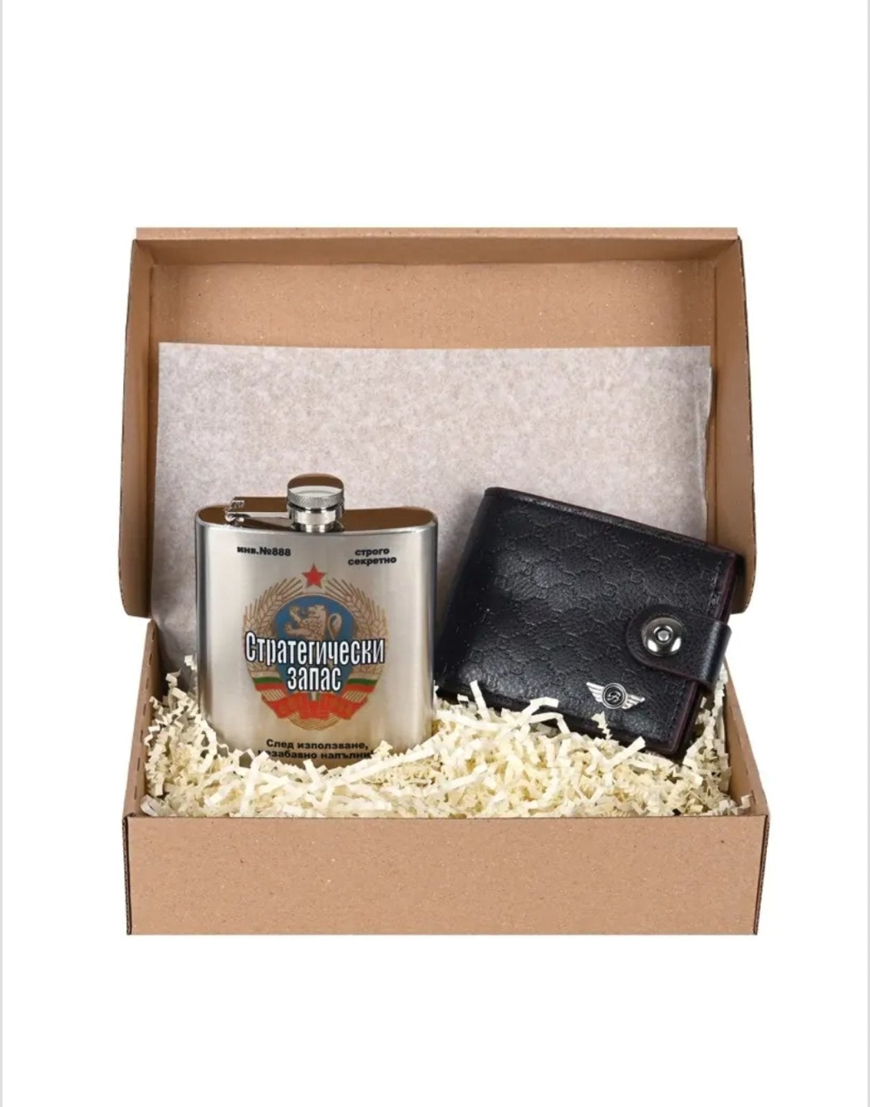 Мъжки подаръчен комплект "Стратегически запас" с кожен порфейл и манерка /7 oz = 207 милилитра/, кожен портфейл с две отделения за банкноти, 4 вътрешни гнезда за карти, вътрешен прозрачен джоб, голямо отделение с цип, магнитна закопчалка