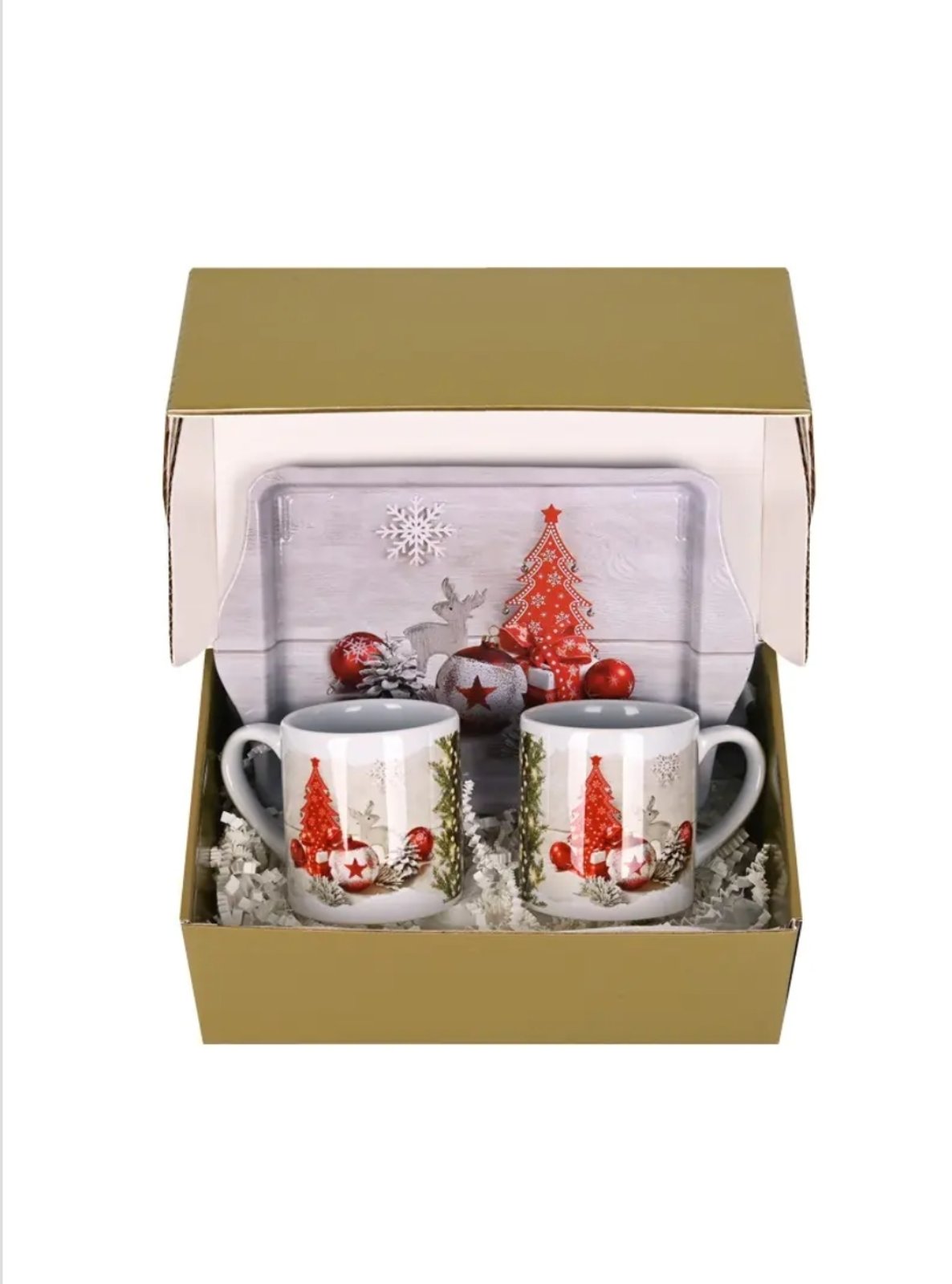 Подаръчен комплект "Весели празници с коледни мотиви" с две чаши за кафе и метална табла.