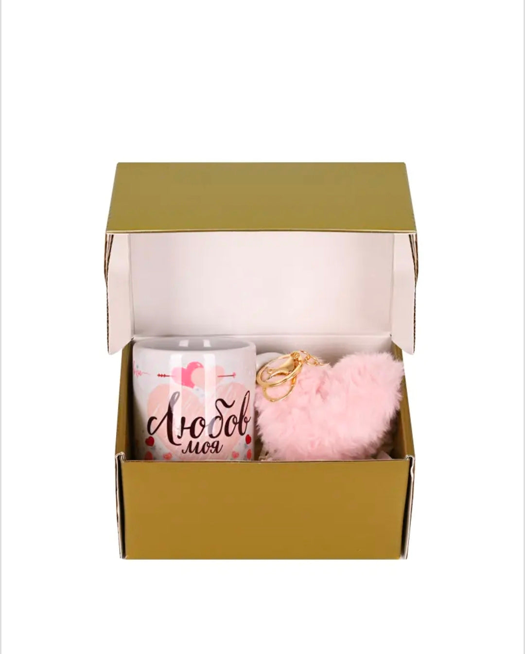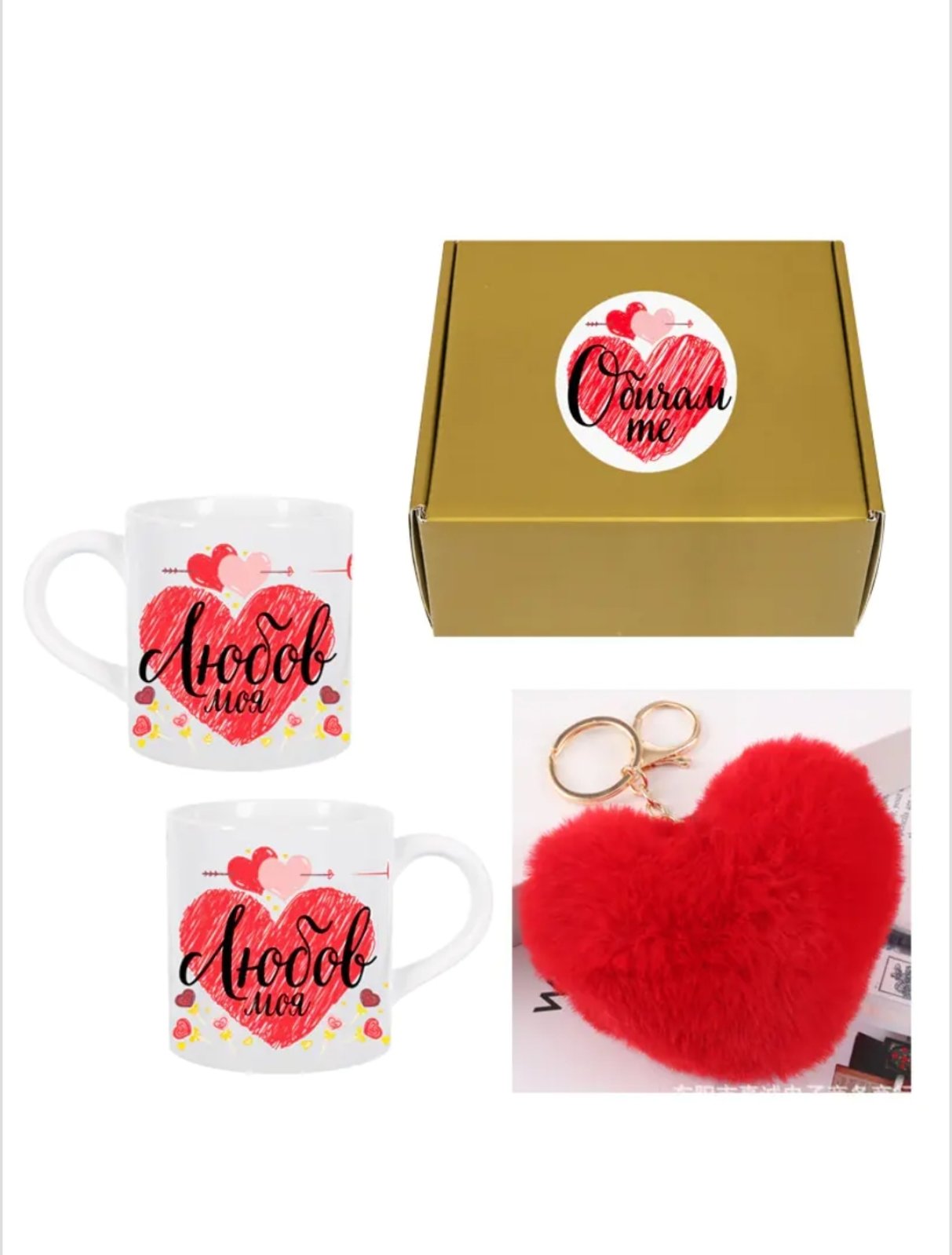 Подаръчен комплект "Обичам те" с чаша и плюшен ключодържател "Сърце"