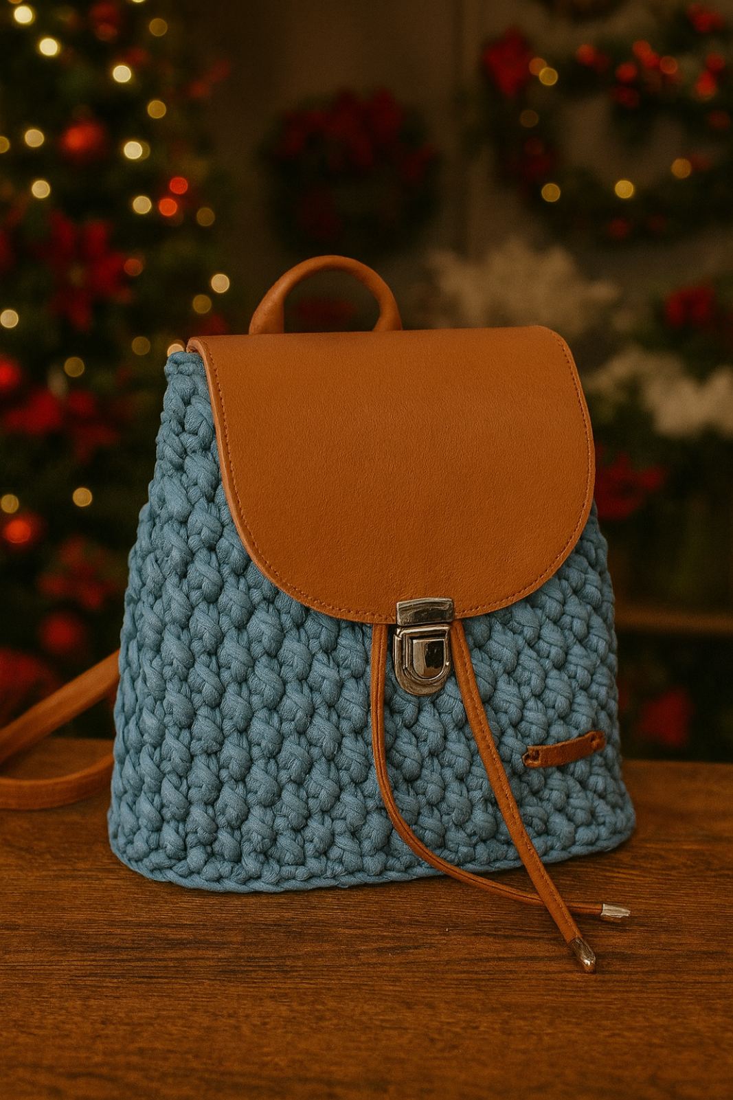 Ръчно изработена от памучна нишка, рециклиран памук и кожа с хастар от текстил.
