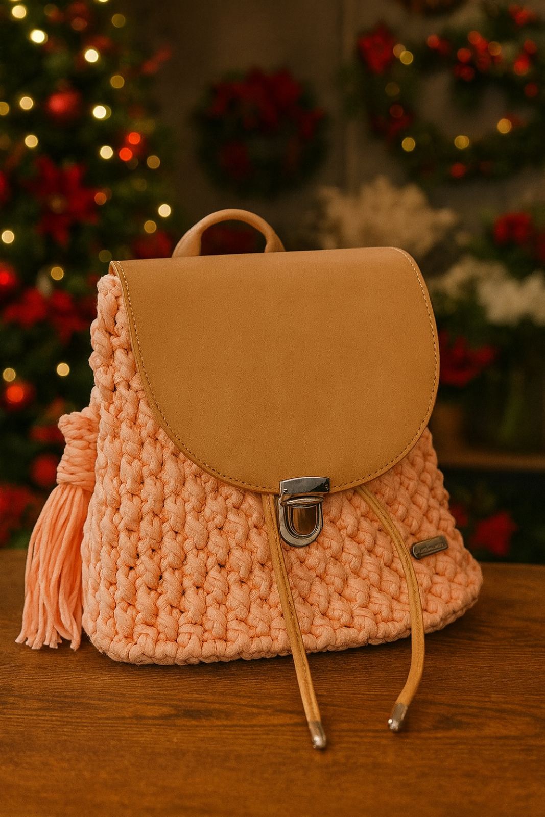 Ръчно изработена от памучна нишка, рециклиран памук и кожа с хастар от текстил.