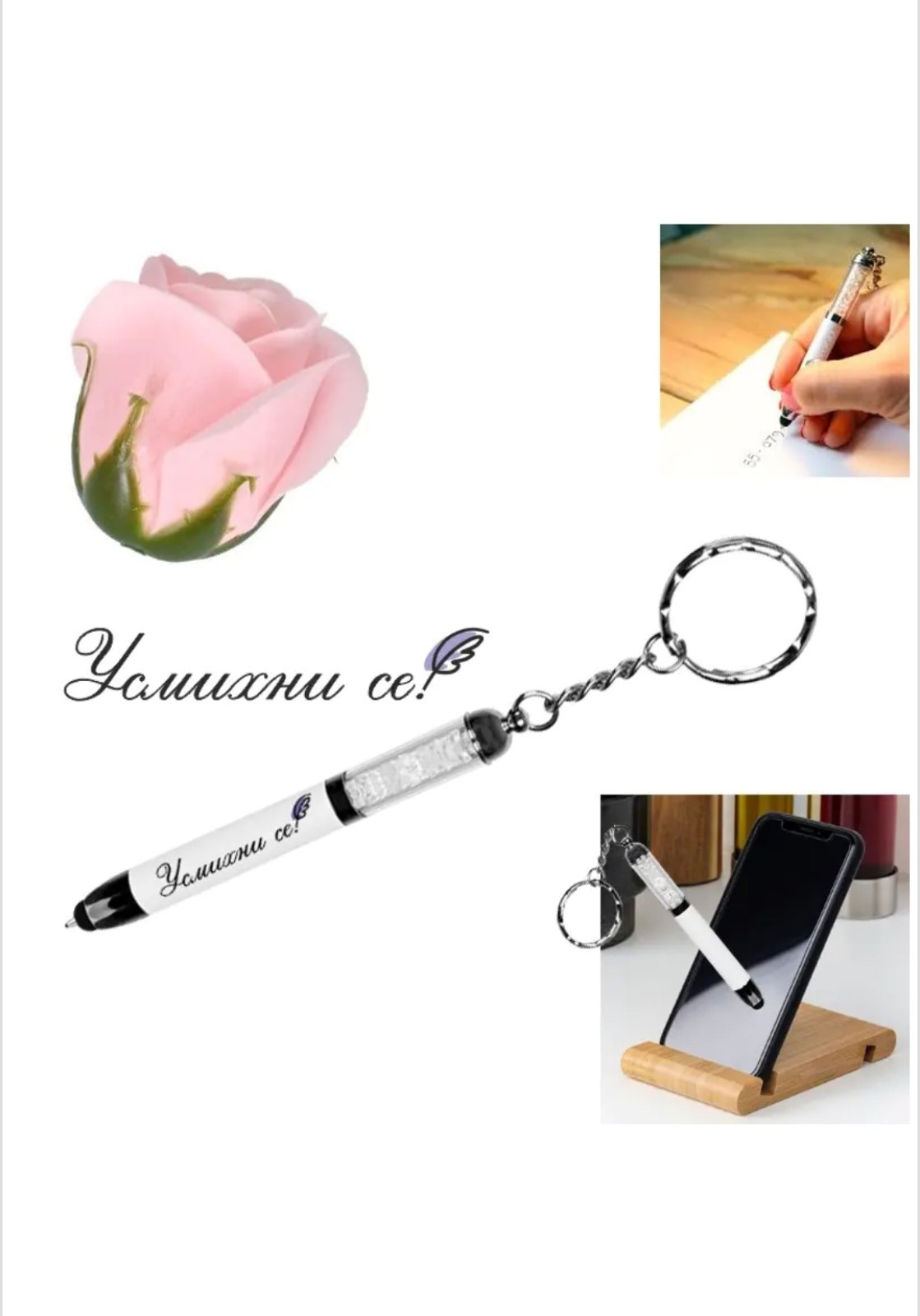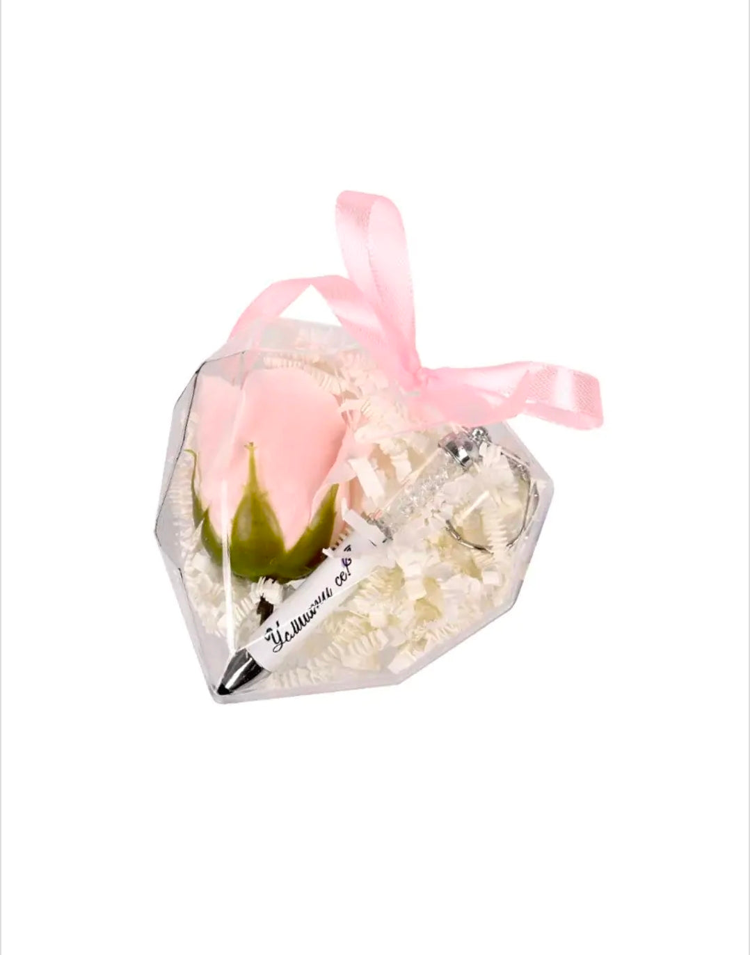 - сапунена роза и елегантен химикал - ключодържател със стилус и кристали в кутийка сърце /ПВЦ/.