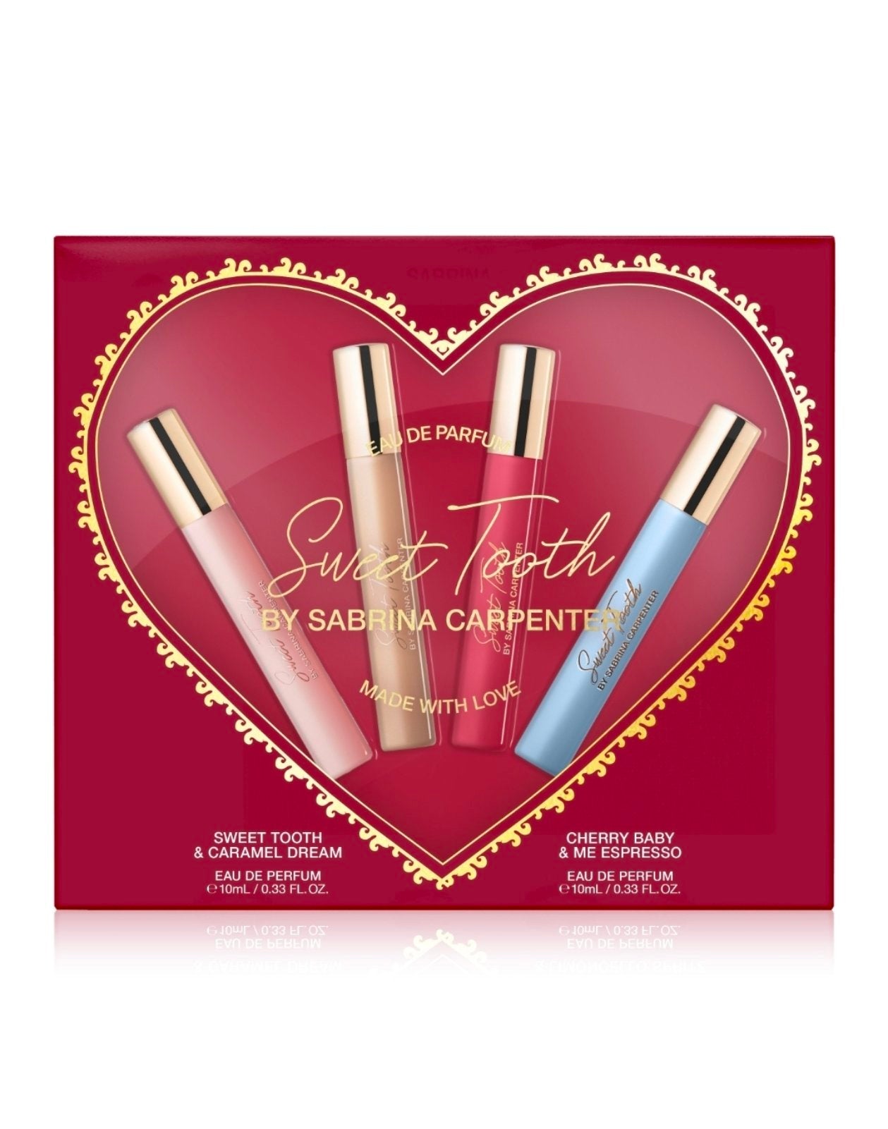 Sabrina Carpenter – Четири аромата, една колекция! Мини парфюми Sweet Tooth, Caramel Dream, Cherry Baby и Me Espresso в една елегантна кутия. Перфектният комплект за всяка дама, която обича разнообразието. Отвори вратата към ароматно пътешествие, което те следва навсякъде и прави всеки ден уникален. Всеки аромат разказва своя история и ти позволява да изразиш различните си настроения и стилове с лекота и увереност. Осмели се, играй и експериментирай – тази колекция ти дава свободата да бъдеш различна всеки ден. (парфюмни води, 4 x 10 мл: Sweet Tooth, Caramel Dream, Cherry Baby, Me Espresso)